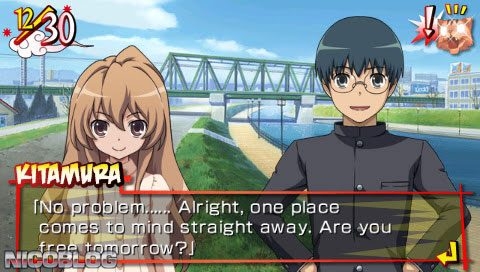 Toradora! Portable" is developed by Guyzware and published by Namco Bandai Games. The player assumes the role of Ryuuji Takasu where he moves around school and town, conversing with characters and working towards multiple endings as part of an original storyline. The game also features a minigame where players play as Taiga, fending off lovesick guys.