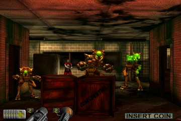 Area 51: Site 4 is a 1998 arcade video game developed by Mesa Logic and released by Atari Games in the USA on September 7, 1998. Area 51: Site 4 is the sequel to the 1995 arcade video game, Area 51. The game is divided into two sections, "Field Exercises" and "Beyond Area 51," and the player may choose which one to play first. Field Exercises allows the player to choose one of three levels (Sites 1, 2, and 3), ranked by difficulty and each consisting of six missions that may be played in any order. Every mission requires the player to meet a stated objective, such as shooting a set number of attacking zombies or aliens, destroying missiles before they can reach Earth, or stopping aliens from overturning a bus. One life is lost whenever the player fails a mission, and the success threshold is set lower for the next attempt; if all lives are lost, the game ends. The player earns a score bonus for completing all six missions at a site, and can earn special weapons or unlock secret areas by shooting certain objects in the background. Beyond Area 51 sends the player to Site 4, in a mission resembling gameplay of the original Area 51. Special weapons earned in the Field Exercises can be used during this portion of the game, in which the player enters a vast warehouse infested by aliens. The final boss is a giant alien queen with multiple limbs, who must be destroyed within a time limit. The game ends when the player either runs out of lives due to shooting S.T.A.A.R. agents or being hit by enemy attacks, or runs out of time without destroying the queen. After the game is beaten, a short sequence of clips is played involving S.T.A.A.R. members, ending with the message, "S.T.A.A.R. Wants You!" similar to the real-world Uncle Sam army recruitment posters. The intro is only seen in attract mode as an intro loop. The end credits can only be seen after playing without entering initials.