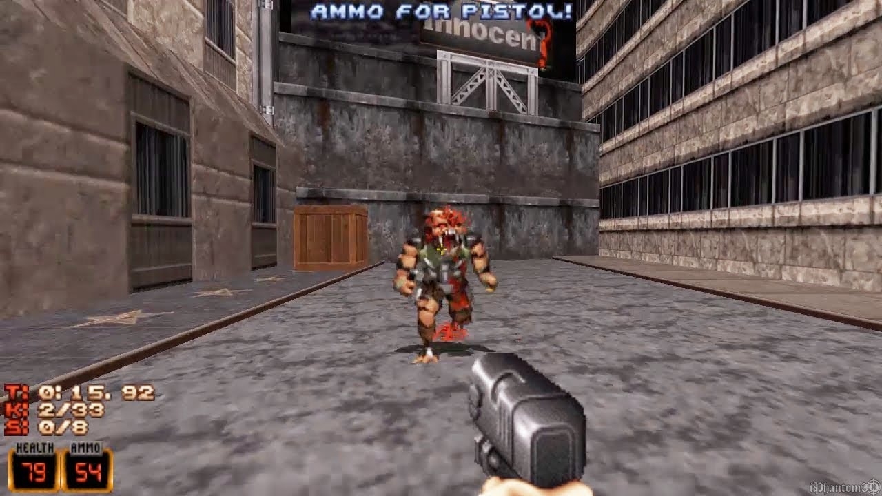 As a first-person shooter, the gameplay of Duke Nukem 3D involves moving through levels presented from the protagonist's point of view, shooting enemies on the way. The environment of Duke Nukem 3D is highly destructible and interactive; most props can be destroyed by the player.