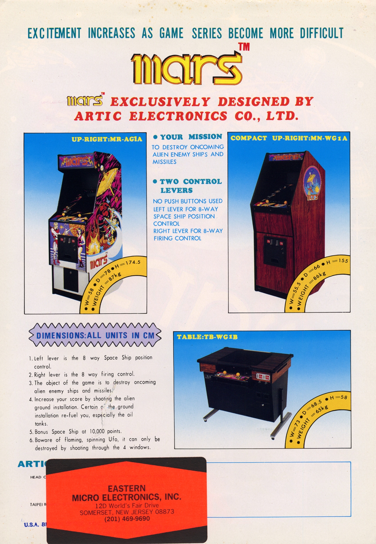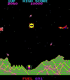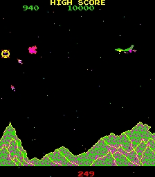 The player pilots a sputnik-shaped spaceship over a leftward scrolling landscape. The machine gun can be fired in eight directions. Destroy the ground based enemies.