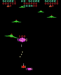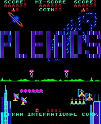Pleiads is a 1981 arcade video game developed and released by Tehkan in Japan on April 1, 1981. Pleiads is a multi-stage space shoot 'em up in which enemy ships fly at the player in waves in a similar fashion to games like Galaxian and Phoenix. Ships emerge from a mothership at the top of the screen and swoop downwards in a series of patterns which players must anticipate as they shoot the ships and avoid being obliterated by the Martian onslaught. There are four stages in the game. In the first stage the Earth space ship must defend the space station from Martian invaders who have the ability to transform from flying invaders, to walking invaders who build walls across the Earth city; these barriers must be destroyed. At the end of stage one the Earth space ship flies to the top of the screen to prepare to meet stage two. In the second stage the player encounters eight space monsters who must be hit directly on center to be destroyed before moving onto stage three. In this stage invaders emerge form a space ship at the top of the screen and swoop down on the player in sweeping attacks. In the final wave the player has to navigate through parked spaceships to dock on a landing pad as the screen scrolls downwards. Extra points can be gained in this stage by collecting flags as the player moves towards the landing corridor.