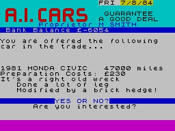 NEW WHEELS, JOHN? How much can you squeeze out of the bank manager? Are you looking for a seedy back-street car-lot or a touch of class? Can you spot a bargain at the auction or have you got the nerve to clock a banger? Watch out for the Old Bill, the man from the council, the smart-alec punter and the time- waster. Try to survive in business long enough to pay off you bank loan; you might even earn a quid or two. NEW WHEELS, JOHN?
