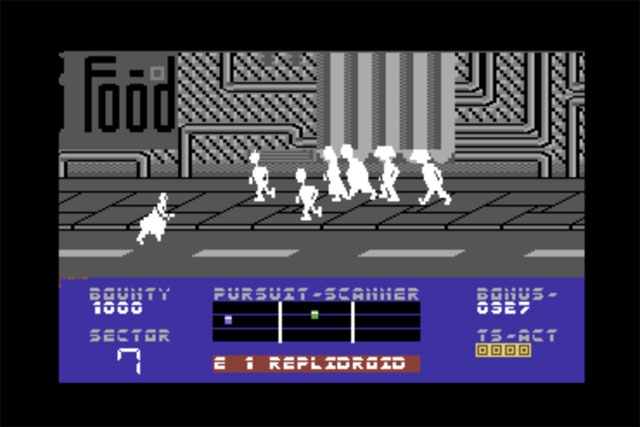 Blade Runner is a video game loosely inspired by the 1982 film Blade Runner, but actually based on the movie soundtrack by Vangelis as the publishers were unable to obtain a licence for a film tie-in. The game was published in 1985 by CRL Group. The plot of the game is similar to the associated movie. Replidroids (sic for replicants), designed for use in space, have been banned from Earth following a revolt on a colony. The role of eliminating any replidroids found on earth is given to a unit of bounty hunters. The game features the player character hunting down replidroids for bounty money.[1] On loading the game, the player has to listen to around two minutes of music from the movie soundtrack without any ability to skip the sequence.[3] Author Will Brooker notes that due to the computers' sonic limitations, the "grandiose swoops and fanfares" of the soundtrack were reduced to "a tinny one-channel burble".[4] The game first presents the player with a map showing the locations of the fugitive replidroids and the player's flying car, which must be steered over a droid on the map. At this point the game switches to a side scrolling game in which the player must avoid crowds and cars whilst in pursuit of the replidroid.[5] As the levels increase, so does the level of the replidroids. The first level droids are slow and stupid, but the sixth level ones are faster than a human