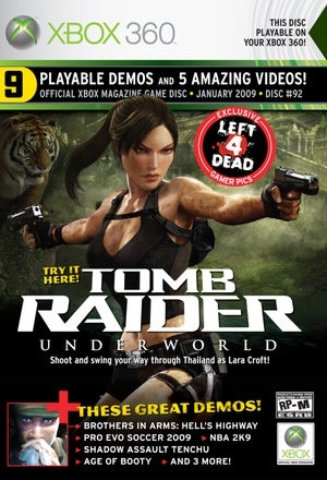 The Official Xbox Magazine demo disc, produced by Microsoft and Future Networks. This issue is playable exclusively on the Xbox 360 game system. PLAYABLE - Age of Booty; Brothers in Arms: Hell's Highway; Crazy Mouse; Domino Master; Madagascar: Escape 2 Africa; NBA 2K9; Pro Evolution Soccer 2009; Shadow Assault Tenchu; Tomb Raider Underworld VIDEO - Halo 3: Recon; Naruto: The Broken Bond; Resident Evil 5; Tekken 6; Tomb Raider Underworld FEATURES - Tekken 6 (Art); Bayonetta (Art); Resident Evil: Degeneration (Art); Army National Guard (Promo & Warrior II video); OXM Universe; Backward-Compatibility Update; Review Roundup LOCKED CONTENT - Left 4 Dead (gamer pics)