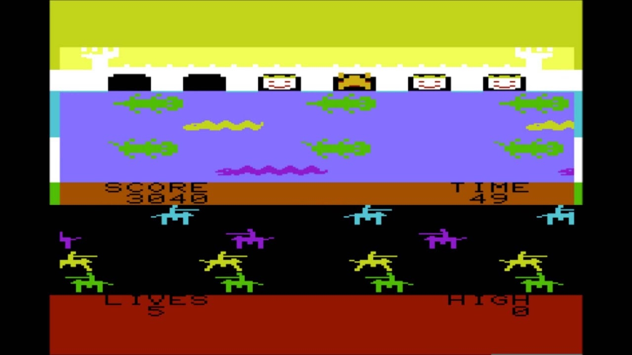 This take on Frogger features music and speech. In this variation, you are a frog trying to get to the princess's castle. You must first cross a road filled with jousting knights on horseback. You must then cross the moat, filled with snakes and alligators. The alligators will submerge, drowning your frog if he's riding on that alligator's back. If you make it safely, you become a handsome prince.