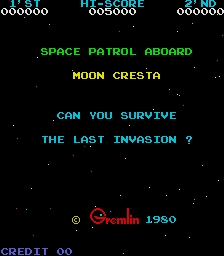 Moon Cresta is a 1980 arcade video game developed by Nichibutsu and released by Gremlin/Sega in the USA on August 1, 1980. The player begins the game with a small spaceship armed with a single laser cannon. After successfully completing the first four waves of alien attacks, the player must attempt to dock the ship with the next 'stage' of the ship. This second stage has two lasers in addition to the original one. Each docked stage is one of the player's "lives". After successfully clearing two more waves of aliens, the player must again dock with the third and final piece of the ship, which also has two more lasers (giving the player five lasers in total). The trade-off for this is that the entire ship is a much larger target. Failure to correctly align the stages during either docking sequence causes the destruction of the stage being docked with. After completing the first eight waves, the player's ship reverts to the first stage and the process is repeated. If any of the player's three ships are lost along the way, the docking sequence occurs only after the first four waves have been completed. Play ends when all three of the player's ship-stages are destroyed.