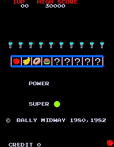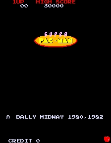 Super Pac-Man is a 1982 arcade video game developed by Namco and released by Bally Midway in the USA on October 1, 1982. Super Pac-Man is the fourth game in the Pac-Man series and the second game in the Pac-Man series to be developed by Namco in Japan. Sound and gameplay mechanics were altered radically from the first two entries into the Pac-Man series—instead of eating dots, the player is required to eat keys in order to open doors, which open up sections of the maze that contain what in earlier games were known as "fruits" (foods such as apples and bananas, or other prizes such as Galaxian flagships), which are now the basic items that must be cleared. Once all the food is eaten, the player advances to the next level, in which the food is worth more points. In earlier levels, keys unlock nearby doors, while as the player progresses through the levels, it is more common for keys to open faraway doors. Pac-Man can enter the ghost house at any time without a key. In addition to the original power pellets which allow Pac-Man to eat the ghosts, two "Super" pellets are available and will turn Pac-Man into Super Pac-Man for a short time. In this form, he becomes much larger, can move with increased speed when the "Super Speed" button is held down and has the ability to eat through doors without unlocking them. He is also invulnerable to the ghosts, who appear thin and flat in order to give the illusion of Super Pac-Man "flying" over them. He still cannot eat them without the help of the original power-up. When Super Pac-Man is about to revert to regular Pac-Man, he flashes white. The Super power can then be prolonged by eating a power pellet or super pellet, if available. A point bonus can be scored if Pac-Man eats a star that appears between the two center boxes while assorted symbols flash inside them. Usually, one symbol stops while the other continues until the star is eaten, a life is lost, or too much time elapses. If the star is eaten when two symbols match, the bonus is 2000 points for any match, and 5000 points if the matching symbols are the same as the level being played. Otherwise, the bonus is similar to the award for eating a ghost, which is 200, 400, 800 or 1600 points, depending on the level. (On some versions, higher levels might pay out the 2000 or 5000 points no matter what the symbols are.) Bonus levels appear at intervals. Here, the player is presented with a maze full of food items and must eat them all in order to collect the points on a countdown timer. Pac-Man appears in Super Mode throughout the stage, and there should be no ghosts.