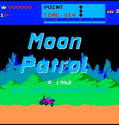 Moon Patrol is a 1982 arcade video game developed by Irem and released by Williams Electronics in the USA on August 1, 1982. As a Luna City police officer assigned to Sector Nine, the home of the "toughest thugs in the galaxy", the player controls a Moon buggy that travels to the right over the horizontally scrolling surface of the Moon. Craters, mines, and other obstacles on the ground must be shot or jumped over. Three types of flying UFOs attack from above and must be shot down. One of the flying enemies has a weapon which creates a crater when it hits the ground. Gameplay takes place on two courses, each divided into 26 checkpoints identified with letters of the English alphabet. Of these, the five major checkpoints—E, J, O, T, and Z—denote a new "stage" with a new background and theme; for example, the third stage starts at J and introduces mines. The top portion of the screen shows a timeline-style map of the course, with the major checkpoints marked. Above the map is an indicator of the current checkpoint, the time spent in the stage, and three indicator lights: the top light indicates upcoming enemy aerial attacks, the middle one indicates an upcoming minefield, and the bottom one indicates enemies approaching from behind. At the end of a stage, that time spent is compared to the average, and bonus points are awarded accordingly, at 1,000 plus 100 per second bettered; completing an entire course gives an additional 5,000 points plus 100 per second bettered. There are two unique courses: the "Beginner Course" and the "Champion Course". The Champion Course "loops" forever, and each loop is numbered for convenience, up to three. Extra lives are given at 10,000, 30,000, and 50,000 points; thereafter, no more lives are given. The game ends when the last patrol car is destroyed. The game can be continued, but points scored from one game do not carry over. 999,990 points is the maximum high score that can be achieved; players can exceed this score, but it "turns over" if they do.