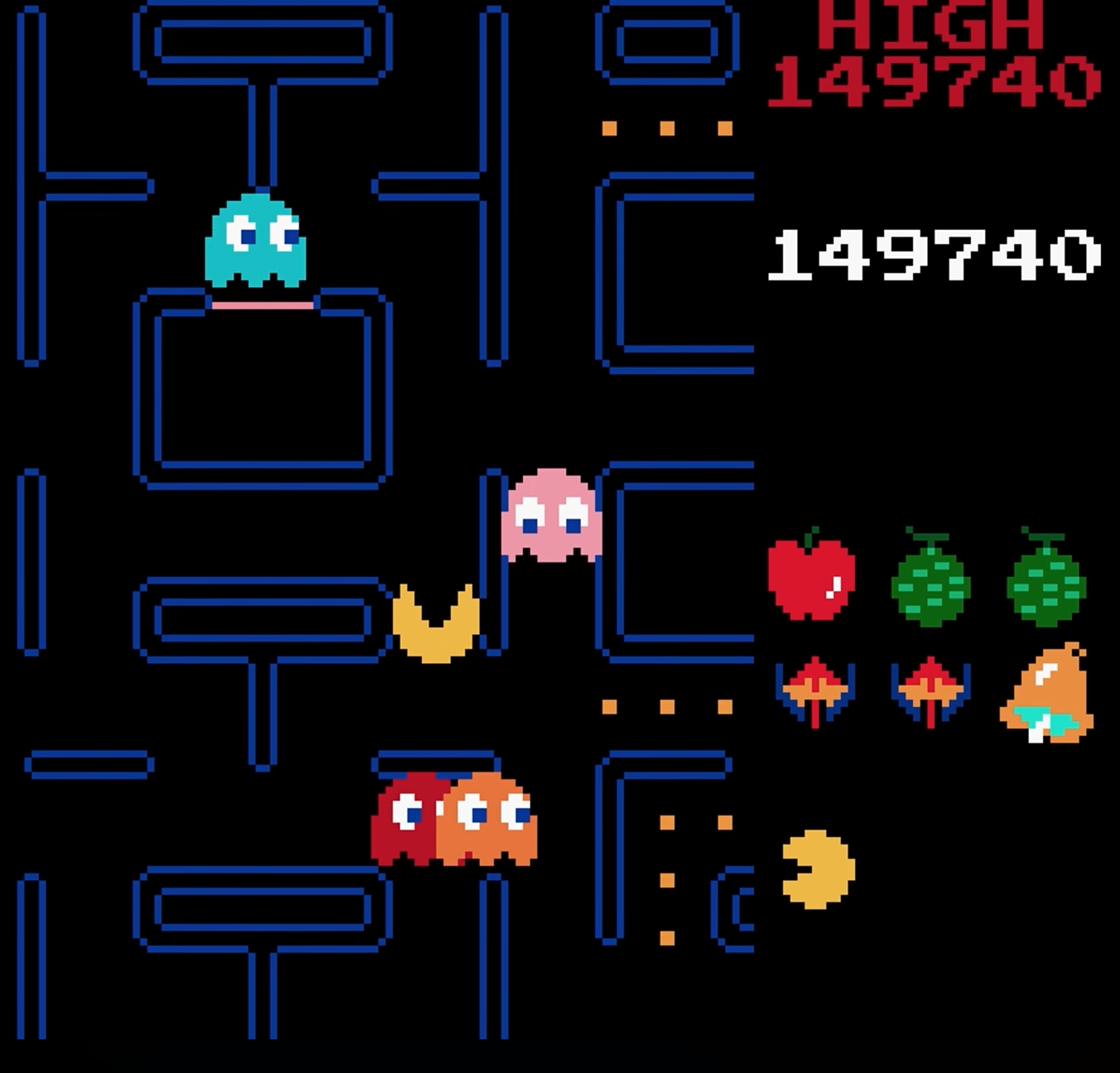 One of the most popular and influential games of the 1980's, Pac-Man stars a little, yellow dot-muncher who works his way around to clear a maze of the various dots and fruit which inhabit the board. Pac-Man's goal is continually challenged by four ghosts: The shy blue ghost Bashful (Inky), the trailing red ghost Shadow (Blinky), the fast pink ghost Speedy (Pinky), and the forgetful orange ghost Pokey (Clyde). One touch from any of these ghosts means a loss of life for Pac-Man. Pac-Man can turn the tables on his pursuers by eating of the four Energizers located within the maze. During this time, the ghosts turn blue, and Pac-Man can eat them for bonus points. This only lasts for a limited amount of time, as the ghost's eyes float back to their center box, and regenerate to chase after Pac-Man again. Survive a few rounds of gameplay, and be treated to humorous intermissions between Pac-Man and the ghosts.
