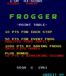 Frogger is a 1981 arcade video game developed by Konami and released by Sega/Gremlin in the USA on October 23, 1981. The objective of the game is to guide a frog to each of the empty homes at the top of the screen. The game starts with three, five, or seven frogs, depending on the machine's settings. Losing all frogs is game over. The player uses the 4-direction joystick to hop the frog once. Frogger is either single-player or two players alternating turns. The frog starts at the bottom of the screen, which contains a horizontal road occupied by speeding vehicles such as race cars, dune buggies, trucks, and bulldozers. The player must guide the frog between opposing lanes of traffic to avoid becoming roadkill and losing a life. After crossing the road, a median strip separates the two major parts of the screen. The upper half consists of a river with logs, alligators, and turtles, all moving horizontally across the screen in opposite directions. By jumping on swiftly moving logs and the backs of alligators and turtles, the player can guide the frog to safety. The player must avoid snakes, otters, and the open mouths of alligators. A brightly colored female frog is sometimes on a log and may be carried for bonus points. The very top of the screen contains five "frog homes", and at least one is always open and available. These sometimes contain bonus insects or deadly alligators. When all five frogs are in their homes, the game progresses to the next level with increased difficulty. After five levels, the difficulty briefly eases and yet again progressively increases after each level. The timer gives 30 seconds to guide each frog into one of the homes, and resets back to 60 ticks whenever a life is lost or a frog reaches home safely. In 1982, Softline stated that "Frogger has earned the ominous distinction of being 'the arcade game with the most ways to die'." There are many different ways to lose a life (illustrated by a skull and crossbones symbol where the frog was), including being run over by a road vehicle; jumping into the river; running into snakes, otters, or an alligator's jaws; sinking while on top of a diving turtle; riding a log, alligator, or turtle off the side of the screen; jumping into a home already occupied by a frog or alligator; jumping into the side of a home or the bush; or running out of time. The opening tune is the first verse of a Japanese children's song called "Inu No Omawarisan" ("The Dog Policeman"). Other Japanese tunes include the themes to the anime series Hana no Ko Lunlun and Rascal the Raccoon. The American release has the same opening song plus "Yankee Doodle". Scoring Every forward step scores 10 points, and every frog arriving safely home scores 50 points. 10 points are also awarded per each unused ½ second of time. Guiding a lady frog home or eating a fly scores 200 points each, and when all 5 frogs reach home to end the level the player earns 1,000 points. A single bonus frog is given at 20,000 points. 99,990 points is the maximum high score that can be achieved on an original arcade cabinet. Players may exceed this score, but the game "rolls over" and only keeps the last 5 digits.