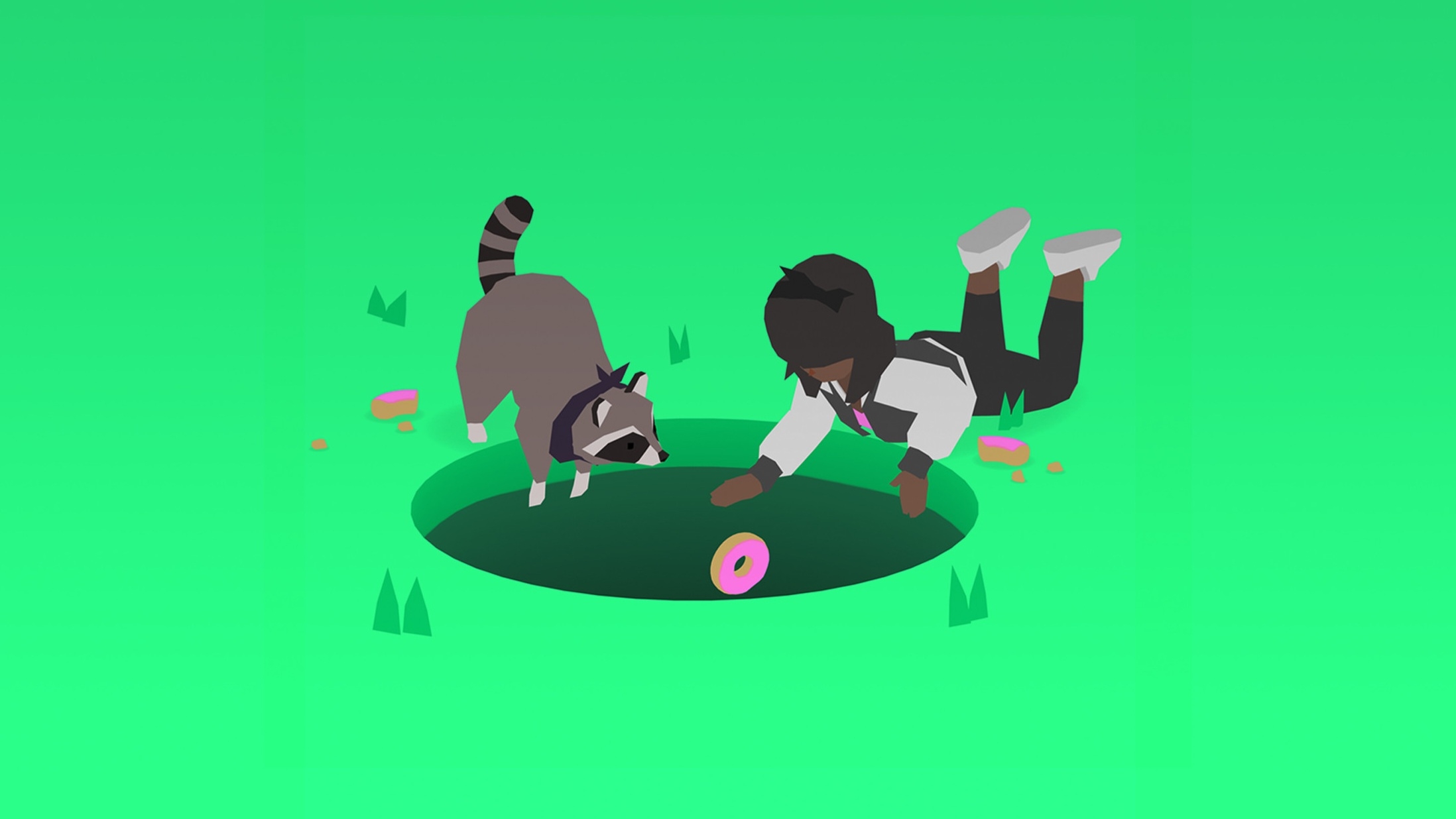 Donut County is a story-based physics puzzle game where you play as an ever-growing hole in the ground. Meet cute characters, steal their trash, and throw them in a hole. Where Trash is Treasure Raccoons have taken over Donut County with remote-controlled trash-stealing holes. You play as BK, a hole-driving raccoon who swallows up his friends and their homes to earn idiotic prizes. When BK falls into one of his own holes, he’s confronted by his best friend Mira and the residents of Donut County, who are all stuck 999 feet underground… and they demand answers! The Hole Keeps Growing • EXPLORE every character’s home, each with their own unique environment. • MOVE the hole to swallow up their stuff, growing bigger each time. • COMBINE objects inside for crazy effects: cook soup, breed bunnies, launch fireworks, and more. • CATAPULT things back out of the hole. You can use it to solve puzzles...or just destroy stuff. • DEVOUR everything. The hole won’t stop until the whole county is all gone.