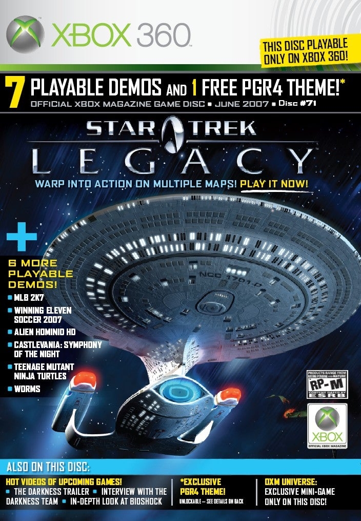 The Official Xbox Magazine demo disc, produced by Microsoft and Future Networks. This issue is playable exclusively on the Xbox 360 game system. PLAYABLE - MLB 2K7; Star Trek: Legacy; Winning Eleven Soccer 2007 XBOX LIVE ARCADE - Alien Hominid HD; Castlevania: Symphony of the Night; Teenage Mutant Ninja Turtles; Worms VIDEO - The Darkness (trailer & preview); BioShock (preview); Progressive Insurance (commercial); Stride Gum (commercial) FEATURES - Ace Combat 6 (art); Project Gotham Racing 4 (art); Eternal Sonata (art); Backward-Compatibility Update; Stride Gum (survey); OXM Universe; Review Roundup LOCKED CONTENT - Project Gotham Racing 4 (theme*); DIRT (art**); Turok (art***) *Requires 800 OXM Points to unlock **Requires 600 OXM Points to unlock ***Requires 400 OXM Points to unlock
